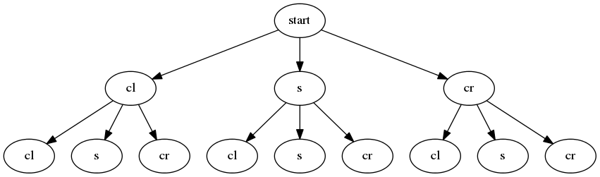Most programming languages have functions or libraries for generating permuations, such as for Python. However, using this approach did prove unpractical (runing on my old PC for example) due to the number of solutions that needed to be tested. A solution that worked better was to use a a [K-ary tree or ternary tree][kary-tree] where K=3 and cr=‘curve right’, cl=‘curve left’, and s=‘straight’ and looks like the following: